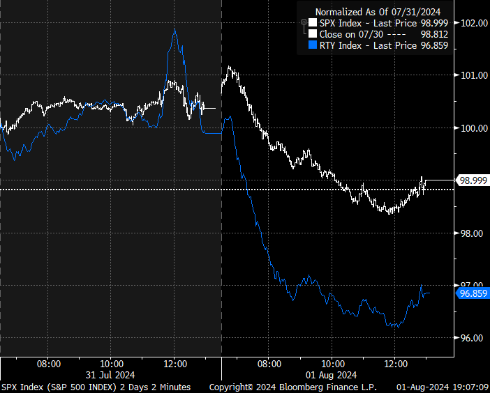 The Russell 2000 (small caps) underperformed vs. the S&P 500: