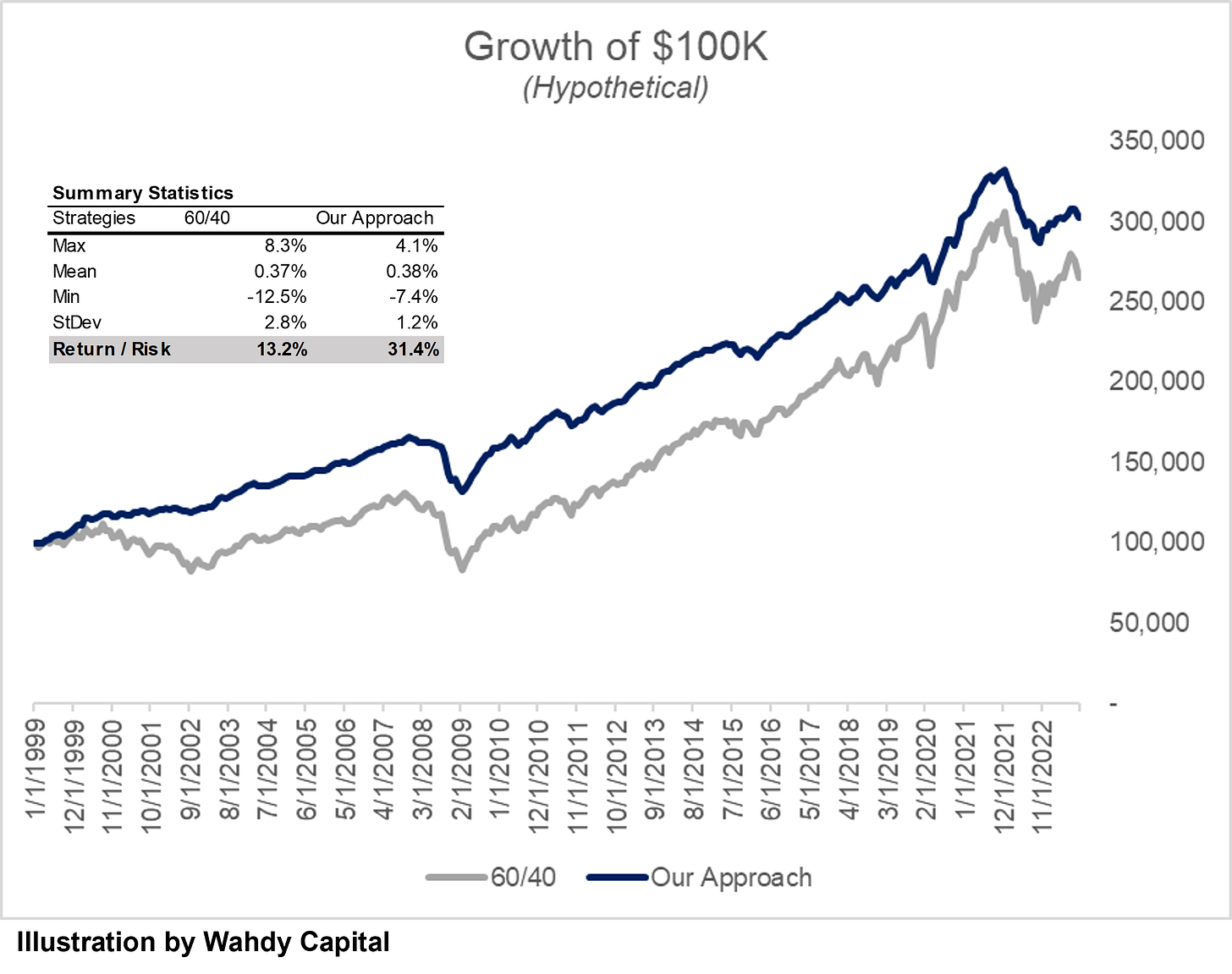 A hypothetical implementation of our asset allocation strategy outperforms a 60/40 portfolio.